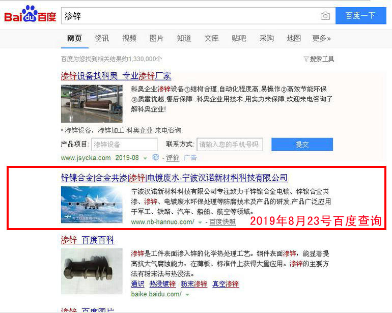 滲鋅 百度(PC)自然排名第1名,360搜索、搜狗、手機搜索等均也有比較好的排名...